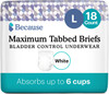 Because Adult Incontinence Tabbed Briefs For Women And Men - Adjustable Unisex Maximum Disposable Underwear, Anti Odor - White, Large - Holds 6 Cups 18 Count (Pack Of 1)