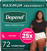 Depend Fresh Protection Adult Incontinence & Postpartum Bladder Leak Underwear For Women, Large (38ÃÂ44" Waist), 72 Count (2 Packs Of 36) Maximum Absorbency: Depend Womenã¢ÂS Bladder Leakage Underwear Features A Super Absorbent Core Which Absorbs 25X Its Weight* And Turns Liquid Into Gel For All-Day Protection (*Weight Of Super Absorbent Material) 2X Drier Than Before: Dependã¢ÂS Improved Liner Wicks Wetness Away From Your Skin To Help Keep You Dry All Day Odor Control: Our Womenã¢ÂS Underwear For Heavy Bladder Helps Neutralize And Lock In Odors By Turning Liquid Into Gel So You Can Feel Comfortable And Confident Comfort: Depend Fresh Protection Is Unlike Bulky Adult Diapers And Features A Soft, Flexible Fabric For A Comfortable Fit Help Protect Against Bladder Leaks With Depend Fresh Protection Adult Incontinence & Postpartum Bladder Leak Underwear For Women With Maximum Absorbencyã¢ÂFor All Day Protection Guaranteed*. Depend Is Unlike Bulky Adult Diapers. Our Bladder Leakage Underwear Features A Super Absorbent Core That Absorbs 25X** Its Weight, Turns Liquid Into Gel, And Helps Neutralize Odors. Our Technology Features A Liner That Helps Keep You Dry Throughout The Day By Wicking Wetness Away From Your Skin. Comfortably Live Your Life With Bladder Leak Underwear That Features A Discreet Fit, Soft And Smooth Fabric, And A High-Performance Waistband That Helps Keep Underwear Securely In Place. Find Your Fit With Five Sizesã¢ÂSmall (24ÃÂ30" Waist), Medium (31ÃÂ37" Waist), Large (38ÃÂ44" Waist), Extra-Large (45ÃÂ54" Waist) And Extra-Extra-Large (55ÃÂ64" Waist)ÃÂIn A Stylish Blush Color. Depend Incontinence And Postpartum Underwear For Bladder Leaks Is Hsa/Fsa-Eligible In The U.S. Also Check Out Our Depend Night Defense Adult Incontinence Underwear For Women To Help Protect Against Nighttime Bladder Leaks! (*If Youã¢ÂRe Not Completely Satisfied With The Fit Of Your Depend Incontinence Underwear, We Can Help. Purchase By 12/31/24. Mail In By 1/31/25. Online Access Required. Limit 1 Per Household. Original Receipt/Upc Required. Restrictions Apply. See Depend Website For Details) (**Weight Of Super Absorbent Material)
