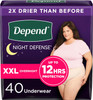 Depend Night Defense Adult Incontinence & Postpartum Bladder Leak Underwear For Women, Extra-Extra-Large (55ÃÂ64" Waist), 40 Count (4 Packs Of 10) Overnight Absorbency: Night Defense Features A Super Absorbent Core Which Absorbs 25X Its Weight* And Turns Liquid Into Gel, Locking Wetness In Place For All-Night Comfort (*Weight Of Super Absorbent Material) Overnight Protection: Our Womenã¢ÂS Bladder Leakage Underwear Delivers Up To 12 Hours Overnight Protection For Heavy Bladder Leaks 2X Drier Than Before: Dependã¢ÂS Liner Wicks Wetness Away From Your Skin To Keep You Dry Odor Control: Our Overnight Underwear For Bladder Leaks Helps Neutralize And Lock In Odors By Turning Liquid Into Gel Sleep Through The Night With Depend Night Defense Adult Incontinence & Postpartum Bladder Leak Underwear For Women With Overnight Absorbency, Providing Up To 12 Hours Of Protection. Available In A Beautiful Blush Color, This Disposable Underwear Is Unlike Adult Diapers And Is Ideal For Incontinence, Postpartum Bladder Leaks, And Nighttime Use. Our Bladder Leak Underwear Features A Super Absorbent Core Which Absorbs 25X Its Weight* And Turns Liquid Into Gel, Helping Neutralize Odors And Locking Wetness In Place. Dependã¢ÂS Liner Is 2X Drier Than Before And Helps Keep You Dry All Night By Wicking Wetness Away From Your Skin. Depend Night Defense For Women Provides A Discreet Fit, Soft And Smooth Fabric And A High-Performance Waistband That Helps Keep Underwear Securely In Place And Helps You Sleep Worry-Free. Depend Night Defense Incontinence And Postpartum Underwear For Bladder Leaks Is Available In Five Sizes: Small (24ÃÂ30" Waist), Size Medium (31ÃÂ37" Waist), Size Large (38ÃÂ44" Waist), Size Extra-Large (45ÃÂ54" Waist) And Size Extra-Extra-Large (55ÃÂ64" Waist). Packaging May Vary From Images Shown. Some More Good News: This Product Is Hsa/Fsa-Eligible In The U.S. (*Weight Of Super Absorbent Material)