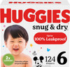 Huggies Size 6 Diapers: 124 Snug & Dry Diapers (2 Packs Of 62), Size 6 (35+ Lbs), Packaging May Vary New & Improved Snug & Dry Disposable Diapers Are Up To 100% Leakproof àEven From Blowouts The Only Leading Brand Entirely Fragrance Free*: Snug & Dry Baby Diapers Are Made Free Of Fragrances, Added Lotions, Parabens And Natural Rubber Latex (*Among Leading National Diaper Brands, Across All Offered Variants) Blowout Blocker: The Only Brand With A Blowout Blocker Across All Our Offerings**(**Among Branded Open Diapers. Excludes Preemie Size) Curved And Stretchy Fit: Huggies Snug & Dry Infant Diapers Have A Curved Fit For Outstanding Leakage Protection Parenting Might Be Hard, But Thanks To Huggies Snug & Dry Baby Diapers, Diapering Doesnã¢ÂT Have To Be. As The Only Leading Brand That Is Entirely Fragrance Free,* Snug & Dry Newborn Diapers Are Made To Be Free Of Fragrances, Added Lotions, Parabens And Natural Rubber Latex. When It Comes To Keeping Your Baby Dry, Snug & Dry Diapers Are There For You Even In Messy Situations. Our Snug & Dry Infant Diapers Are Up To 100% Leak Proof, Even From Blowouts. Made With The Original Leak Lock Blowout Blocker, Snug & Dry Baby Diapers Help Protect Against Blowouts And Ensuing Messes. Additionally, These Diapers Are Designed With A Curved And Stretchy Fit For Outstanding Leakage Protection. Made To Help Your Baby Live Their Best Life, Our Infant Diapers Feature 2X Comfort Design To Provide Outstanding Softness And Gentle Protection. An Added Wetness Indicator Changes Colors When The Diaper Is Wet, Allowing You To Know Right When The Diaper Needs To Be Changed. Featuring Exclusive Disney Designs, Huggies Snug & Dry Diapers Are Available In Size Newborn (6-9 Lb.), Size 1 (8-14 Lb.), Size 2 (12-18 Lb.), Size 3 (16-28 Lb.), Size 4 (22-37 Lb.), Size 5 (27+ Lb.), Size 6 (35+ Lb.), Size 7 (41+ Lb.) And Size 8 (46+ Lb.). (*Among Leading National Diaper Brands, Across All Offered Variants) (**Among Branded Open Diapers. Excludes Preemie Size.)