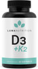 About this item Bone & Heart Health: Luma Nutrition Vitamin D3 and K2 combine to enhance calcium absorption, directing it to the bones while preventing arterial buildup. This synergy supports optimal bone density and cardiovascular health, fostering overall wellness. Immune & Muscle Support: Vitamin D boosts immune function and muscle strength, reducing fall risk in older adults. Paired with Vitamin K2, which manages calcium use and alleviates joint discomfort, this supplement provides comprehensive support for resilience and strength. Enhanced Skin Benefits & Quality: With high-quality Vitamin D3 10,000 IU and Vitamin K2, our supplement supports skin regeneration and elasticity while promoting a youthful complexion. It delivers twice the strength of standard vitamin d3 5000 iu supplements, enhancing both internal health and skin appearance. 30 Day Supply: Each bottle of Luma Nutrition's D3 + K2 supplement lasts for an entire month to maintain optimal freshness and provide strong daily support straight from nature. This all natural circulatory, bone and joint support supplement makes the perfect monthly subscription for men and women alike. Stay in stock and save money at the same time! Made in the USA by Veteran-Owned Small Business: Trust in Luma Nutrition's GMP certified, USA-manufactured supplements that are 3rd party verified. As a veteran-owned brand, we prioritize quality and expert craftsmanship to assist with your health journey. See more product details,Bone & Heart Health: Luma Nutrition Vitamin D3 and K2 combine to enhance calcium absorption, directing it to the bones while preventing arterial buildup. This synergy supports optimal bone density and cardiovascular health, fostering overall wellness,Immune & Muscle Support: Vitamin D boosts immune function and muscle strength, reducing fall risk in older adults. Paired with Vitamin K2, which manages calcium use and alleviates joint discomfort, this supplement provides comprehensive support for resilience and strength,Enhanced Skin Benefits & Quality: With high-quality Vitamin D3 10,000 IU and Vitamin K2, our supplement supports skin regeneration and elasticity while promoting a youthful complexion. It delivers twice the strength of standard vitamin d3 5000 iu supplements, enhancing both internal health and skin appearance,30 Day Supply: Each bottle of Luma Nutrition's D3 + K2 supplement lasts for an entire month to maintain optimal freshness and provide strong daily support straight from nature. This all natural circulatory, bone and joint support supplement makes the perfect monthly subscription for men and women alike. Stay in stock and save money at the same time!,Made in the USA by Veteran-Owned Small Business: Trust in Luma Nutrition's GMP certified, USA-manufactured supplements that are 3rd party verified. As a veteran-owned brand, we prioritize quality and expert craftsmanship to assist with your health journey