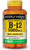 About this item Mason Natural Vitamin B12 Quick Dissolve sublingual tablets contain 5000mcg of B12 and conveniently dissolve under the tongue for quick absorption in the bloodstream. B12 vitamin may help support the normal function of the cardiovascular, pulmonary, and central nervous systems. These 5000 mcg B12 sublingual lozenges are guaranteed to have no added sugar or starch. They are wheat free, corn free, dairy free, and yeast free. Our vitamin B12 also contains no soy, egg, artificial colors, flavors or preservatives. Sodium free. Our Vitamin B12 Quick Dissolve tablets may also may help support the bodys energy production by aiding the metabolism of carbohydrates, fats and proteins. Vitamin B12 also helps many enzymes to perform essential chemical reactions, such as those that support the function of neurotransmitters, hormones, digestive enzymes, and many more. Support Wellness: Explore our full catalog of products including collagen, probiotics, melatonin, fish oil, ginkgo biloba, antioxidants, zinc, ginger and calcium. THE BEST VITAMINS FOR OVER 50 YEARS: For more than five decades, Mason Natural has produced quality vitamin supplements under cGMPs (current Good Manufacturing Practices) and adhering to US guidelines. All ingredients and finished goods are subjected to rigorous analytical testing, inspections and quality auditing. See more product details,Mason Natural Vitamin B12 Quick Dissolve sublingual tablets contain 5000mcg of B12 and conveniently dissolve under the tongue for quick absorption in the bloodstream. B12 vitamin may help support the normal function of the cardiovascular, pulmonary, and central nervous systems,These 5000 mcg B12 sublingual lozenges are guaranteed to have no added sugar or starch. They are wheat free, corn free, dairy free, and yeast free. Our vitamin B12 also contains no soy, egg, artificial colors, flavors or preservatives. Sodium free,Our Vitamin B12 Quick Dissolve tablets may also may help support the bodys energy production by aiding the metabolism of carbohydrates, fats and proteins. Vitamin B12 also helps many enzymes to perform essential chemical reactions, such as those that support the function of neurotransmitters, hormones, digestive enzymes, and many more,Support Wellness: Explore our full catalog of products including collagen, probiotics, melatonin, fish oil, ginkgo biloba, antioxidants, zinc, ginger and calcium,THE BEST VITAMINS FOR OVER 50 YEARS: For more than five decades, Mason Natural has produced quality vitamin supplements under cGMPs (current Good Manufacturing Practices) and adhering to US guidelines. All ingredients and finished goods are subjected to rigorous analytical testing, inspections and quality auditing